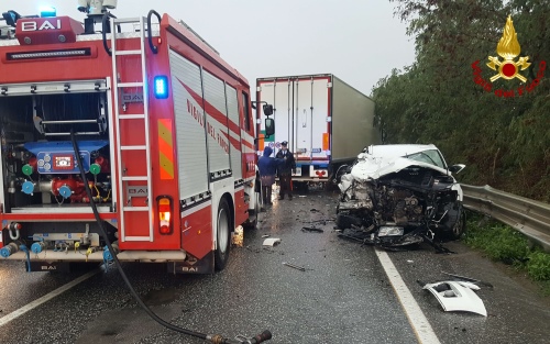 Scontro sulla Statale 106 tra un autocarro e un'auto andata distrutta. Intervento dei Vigili del Fuoco. Questo pomeriggio, alle ore 14.55, una squadra dei vigili del fuoco del