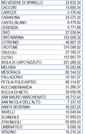Di seguito la tabella degli aiuti del Governo ai comuni del Crotonese: