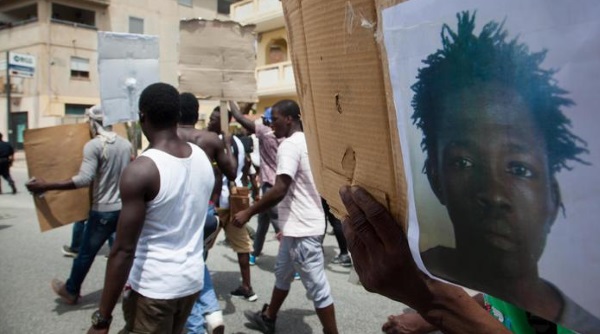 Gruppo di maliani della vecchia tendopoli in corteo verso il municipio di San Ferdinando. (Foto Ansa). A San Ferdinando, nel giorno della mobilitazione decisa dopo l'omicidio di