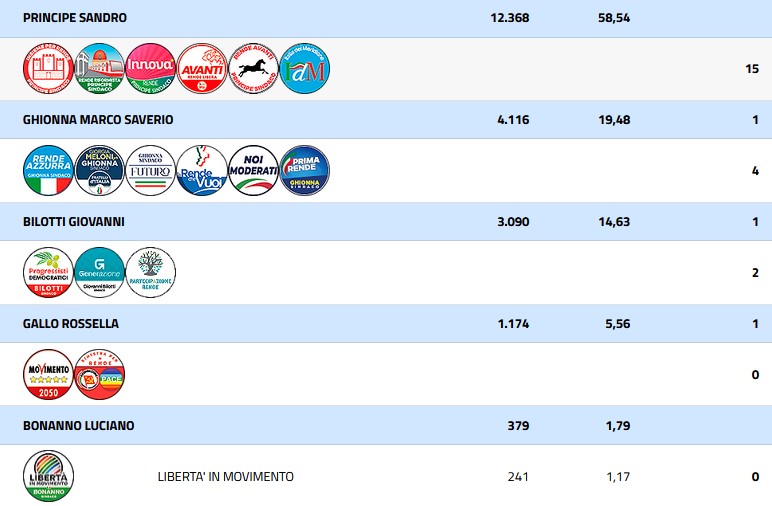 Sandro Principe ha incassato il sostegno di sei liste: Rende Riformista, Avanti Rende Libera-PSI, Rende Avanti, Insieme Per Rende, L’Italia del Meridione, Innova. Marco Saverio Ghionna era invece sostenuto da sei liste: Fratelli d’Italia, La Rende che vuoi, Rende Azzurra, Noi Moderati, Futuro e Prima Rende. Giovanni Bilotti era supportato da tre liste: Partecipazione Rende, Progressisti democratici e G Generazione. Luciano Bonanno era sostenuto dalla lista Libertà in Movimento. Infine Rossella Gallo aveva il supporto di due liste: Sinistra per Rende-Rifondazione Comunista-Pace e Movimento 5 Stelle.