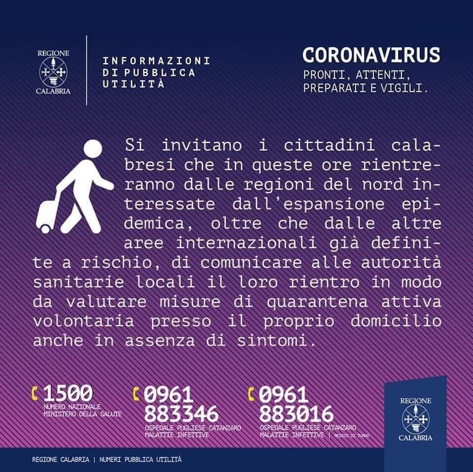 "Si invitano i cittadini calabresi che in queste ore rientrano dalle regioni del