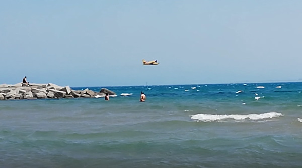 Canadair in azione sul mare di Crotone: vasto incendio si propaga velocemente dalle colline di Salica.Giornata impegnativa per i vigili del Comando provinciale di Crotone che