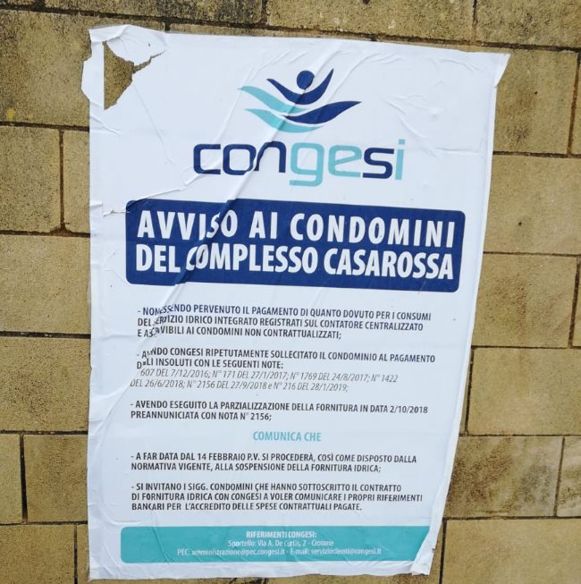 Rigettata la domanda cautelare del condominio Casarossa: dieci giorni per saldare le fatture o sospensione dell'erogazione idrica.Il Tribunale civile di Crotone ha respinto il