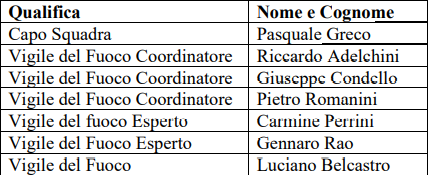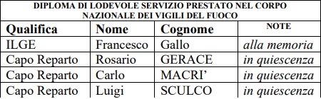 Inoltre, il personale in servizio al quale è concessa la Croce di Anzianità per aver prestato effettivo lodevole servizio nel Corpo nazionale dei Vigili del Fuoco per oltre 15 anni, dando prova di capacità e zelo, sono: